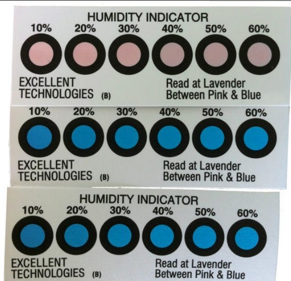 有钴湿度卡(不符合欧盟最新出不标准,不环保):以直观的从颜色变化来判断湿度状况。其原理就是根据氯化钴吸水后产生物质的颜色变色的原理,[Co(H20)4Cl2]为蓝色[Co(H2O)6]2+为红色 干燥时湿度卡是蓝色的,如果圆圈内的颜色从蓝色变化到粉红色,表示包装内的湿度达到或超过了圆圈对应的相对湿度数值。